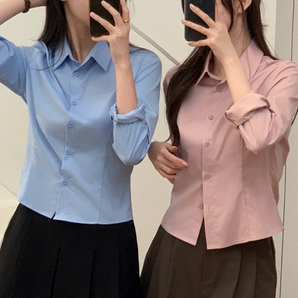 슬리만 느낌의 셔츠 라서 니트 나 가디건 안에 레이어드에서 입기 에 좋은핏 입니다 이번 가을에레이터 어드 에서 정말 잘 입을 교복템 인거 같아요